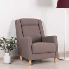 Кресло обтянуто мебельной тканью или искусственной кожей, каркас-дерево, боковины выполнены в виде криволинейных деталей, образующих ножки-опоры, материал боковины фанера. На боковинах имеются мягкие подлокотники. Модель с выдвижной подножкой.